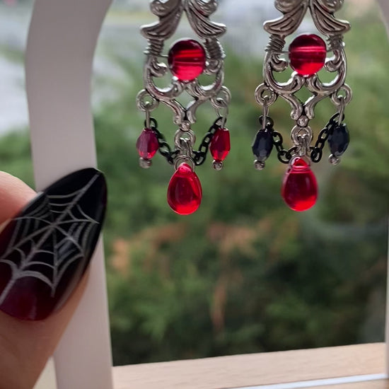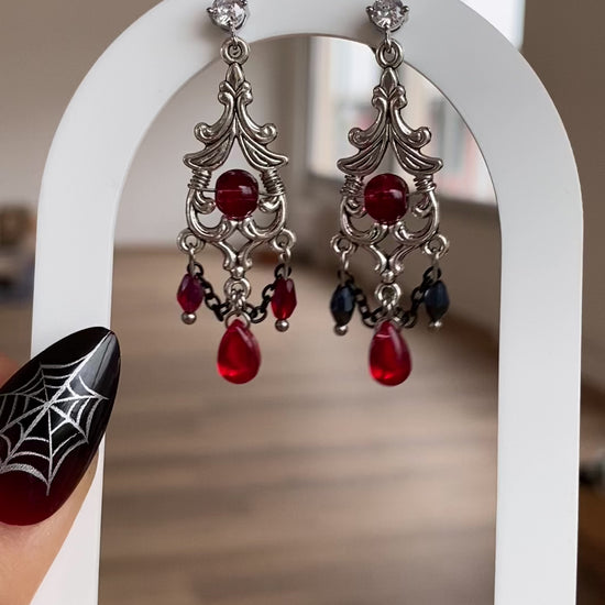 In the shadows of the night, a tale of passion and mystery unfolds. The Ruby Requiem Earrings weaves a spell of dark romance, with silver filigree whispering secrets to the fiery heart of a crimson ruby. Black onyx beads shroud the pendant in mourning, as if guarding a love forever lost. Let the Ruby Requiem Earrings be your whispered secret, your darkest passion, your eternal flame. ⁺‧₊˚ ཐི⋆♱⋆ཋྀ ˚₊‧⁺