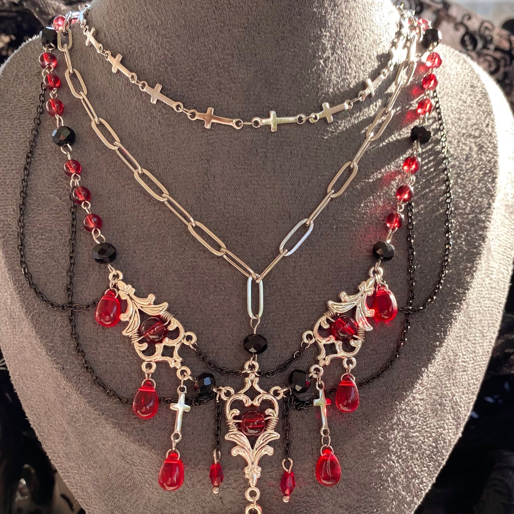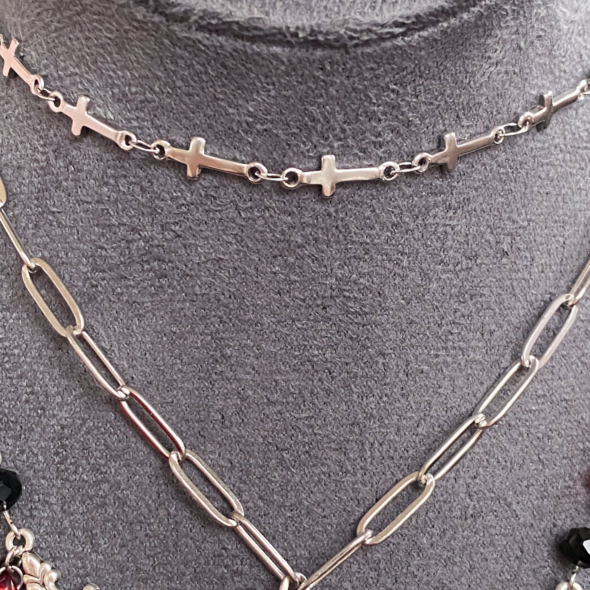 ☾ This 3-layer necklace is made up of 2 detachable necklaces: the cross choker on the top part is completely independent, so it can be worn alone too ⋆˙⟡ This way you'll have 3 necklaces in 1: you can wear the cross choker alone, you can wear the bottom part alone, or you can style them together for a 'wow' effect! This also allows you to adjust the cross choker necklace length as you wish, creating the perfect balance with the bottom part of the necklace.
