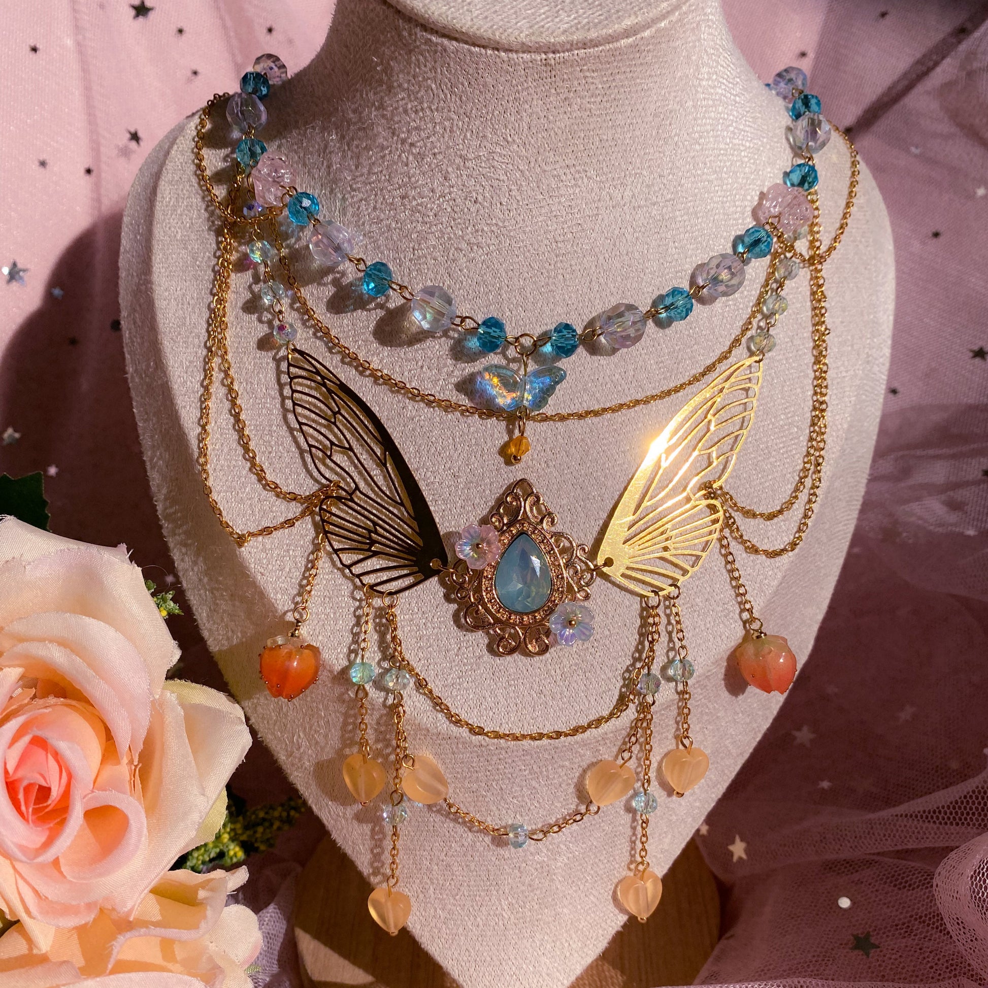 Unfold your wings and let magic bloom with our enchantix Blooming Wings Necklace, inspired by the fiery charm of Bloom from Winx Club.  Suspended from multiple chandelier-style chains, the necklace shimmers with crystal Czech glass beads in soft baby blue and orange hues, evoking the whimsy and wonder of a fairy's garden. This necklace is a lovely reminder to spread your wings and shine ✨🌸🦋