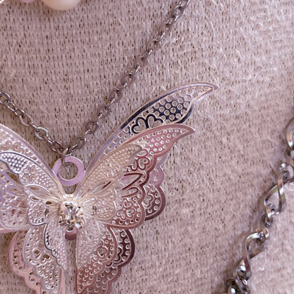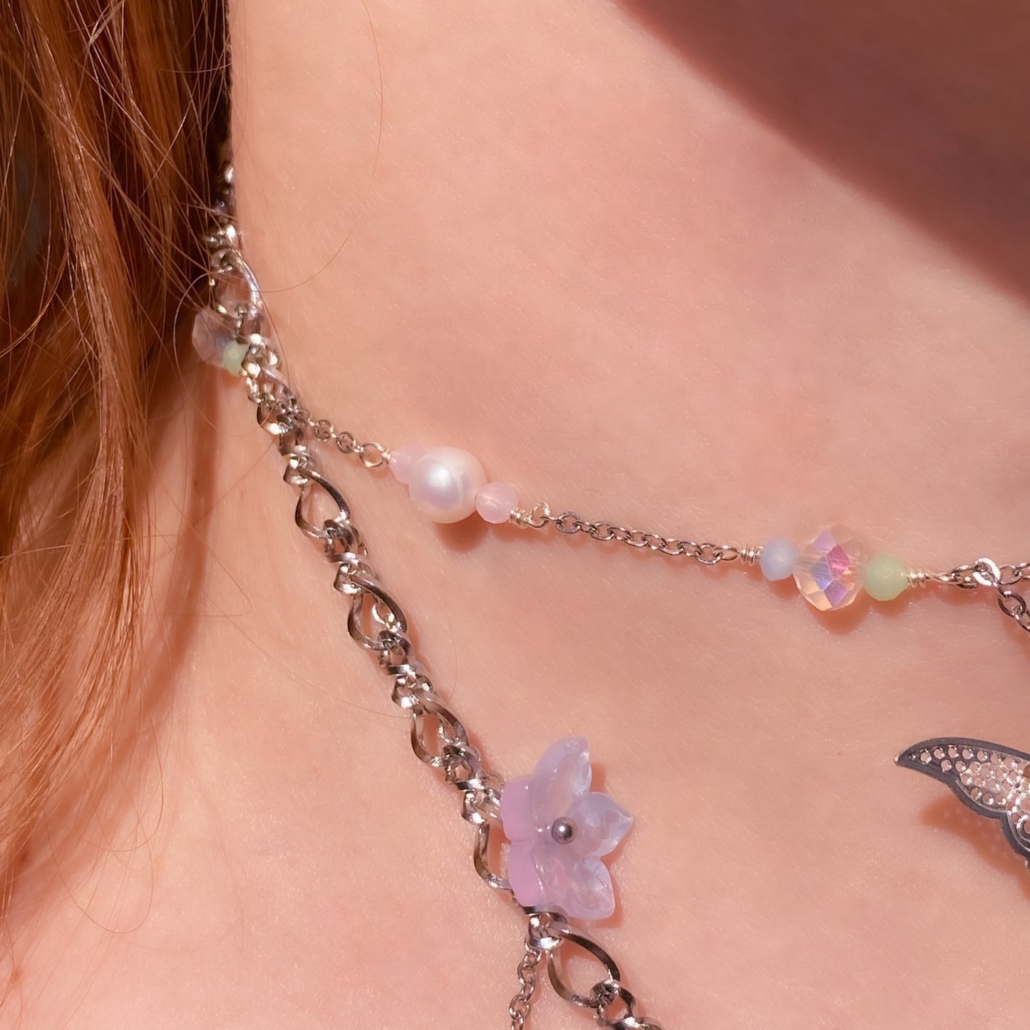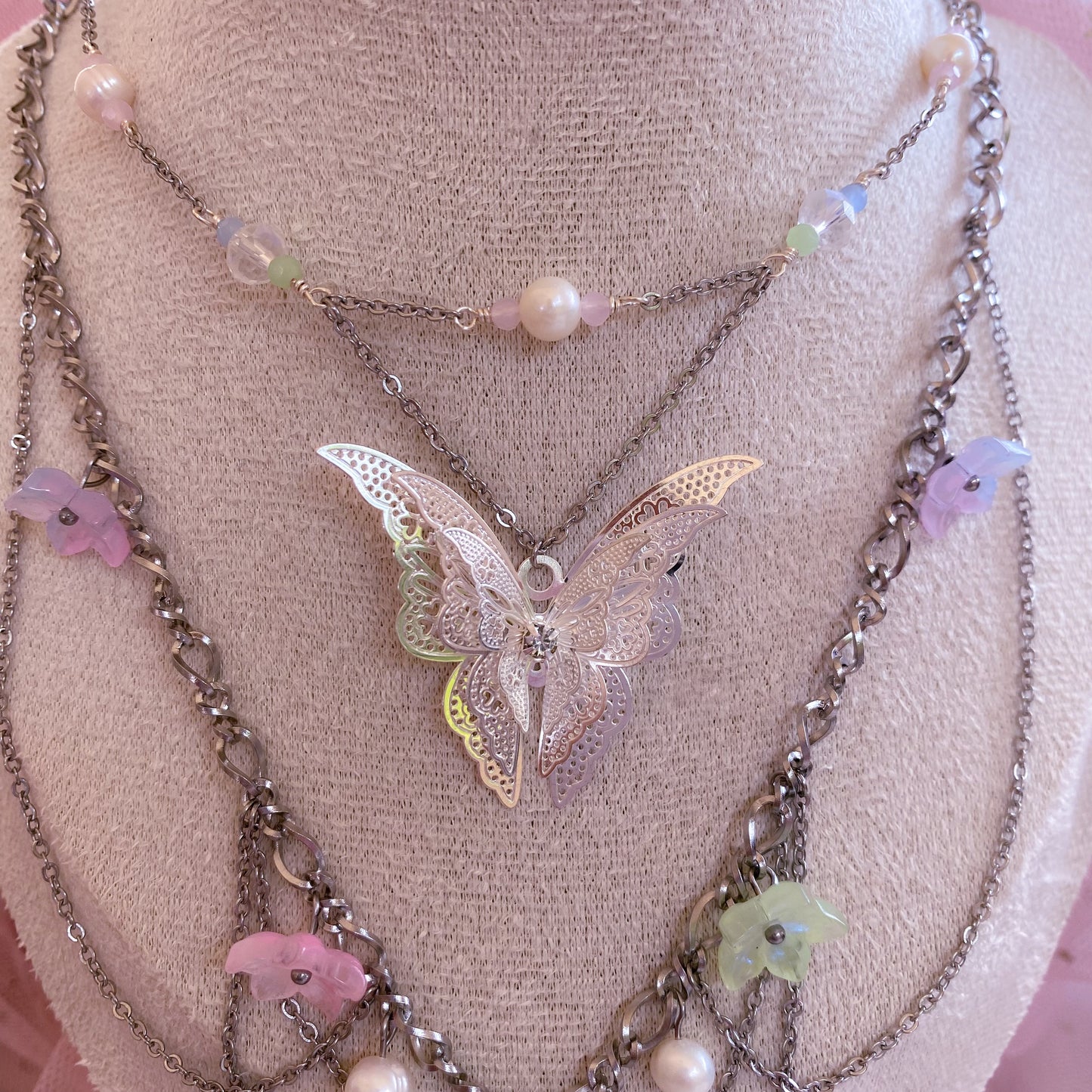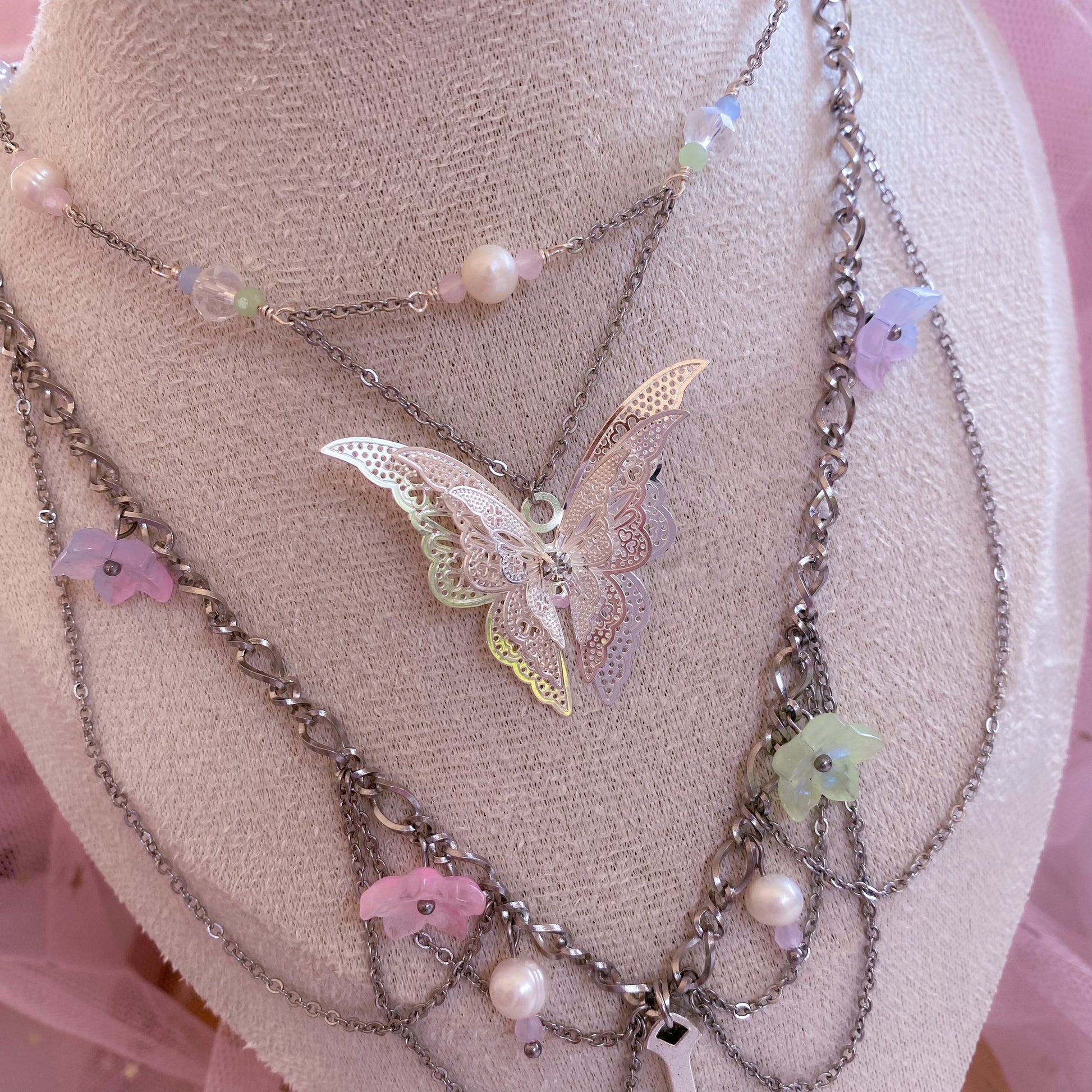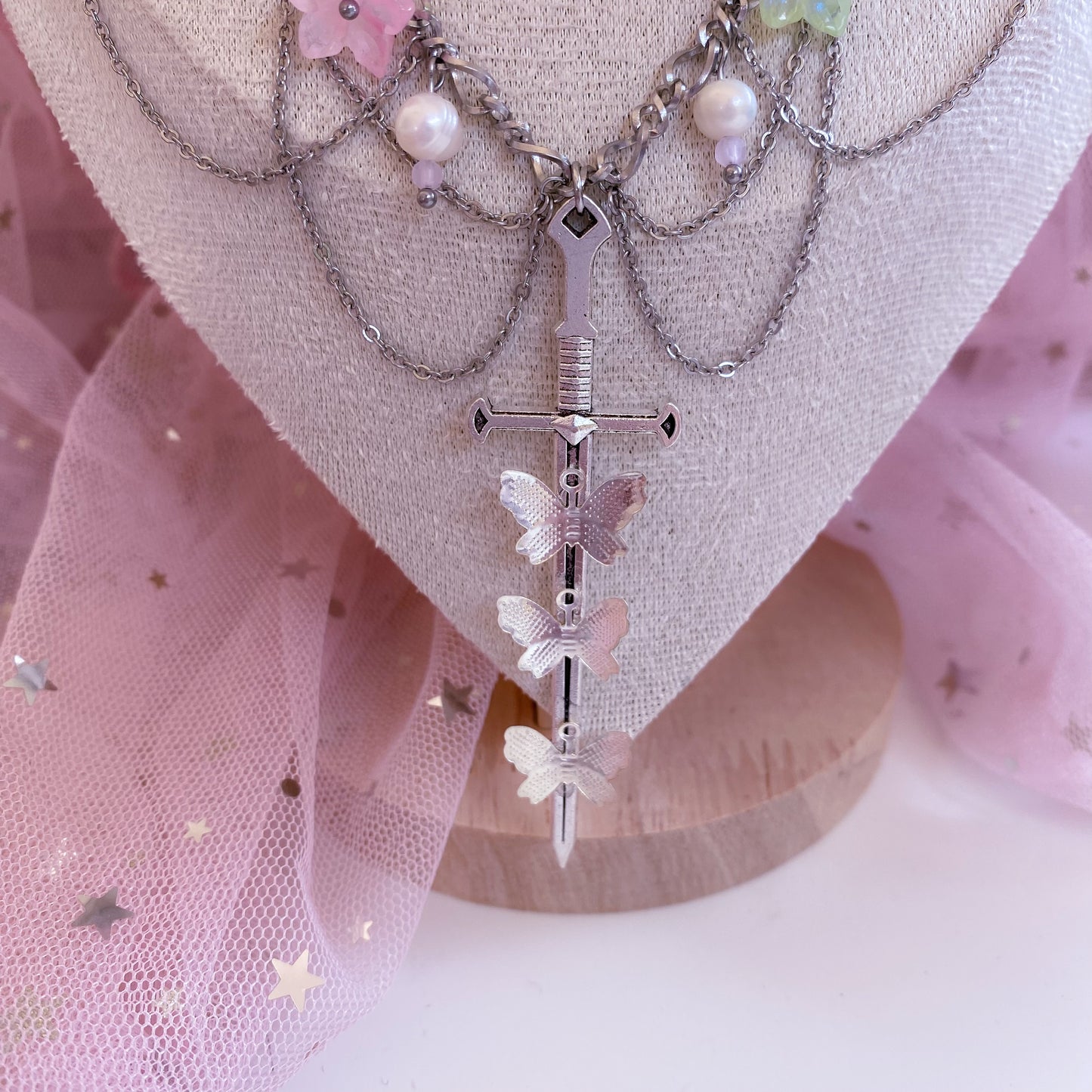 Delicate and dreamy, the Fairy's Kiss Necklace whispers tales of a mystical realm inhabited by faeries and ancient magic. A filigree butterfly pendant dances amidst a cascade of shimmering crystal beads and precious freshwater pearls that sparkle like dew-kissed morning petals. Tiny flower pendants in gentle lavender, pink, and green dance alongside. The necklace's crowning glory is a majestic sword-shaped pendant, adorned with three delicate butterflies on its blade, as if Nature's gentle touch has reclaimed this forgotten treasure. Perfect for fairies and fairy tale lovers alike, this enchanting piece is a testament to the beauty of whimsy and wonder✨🌸🦋