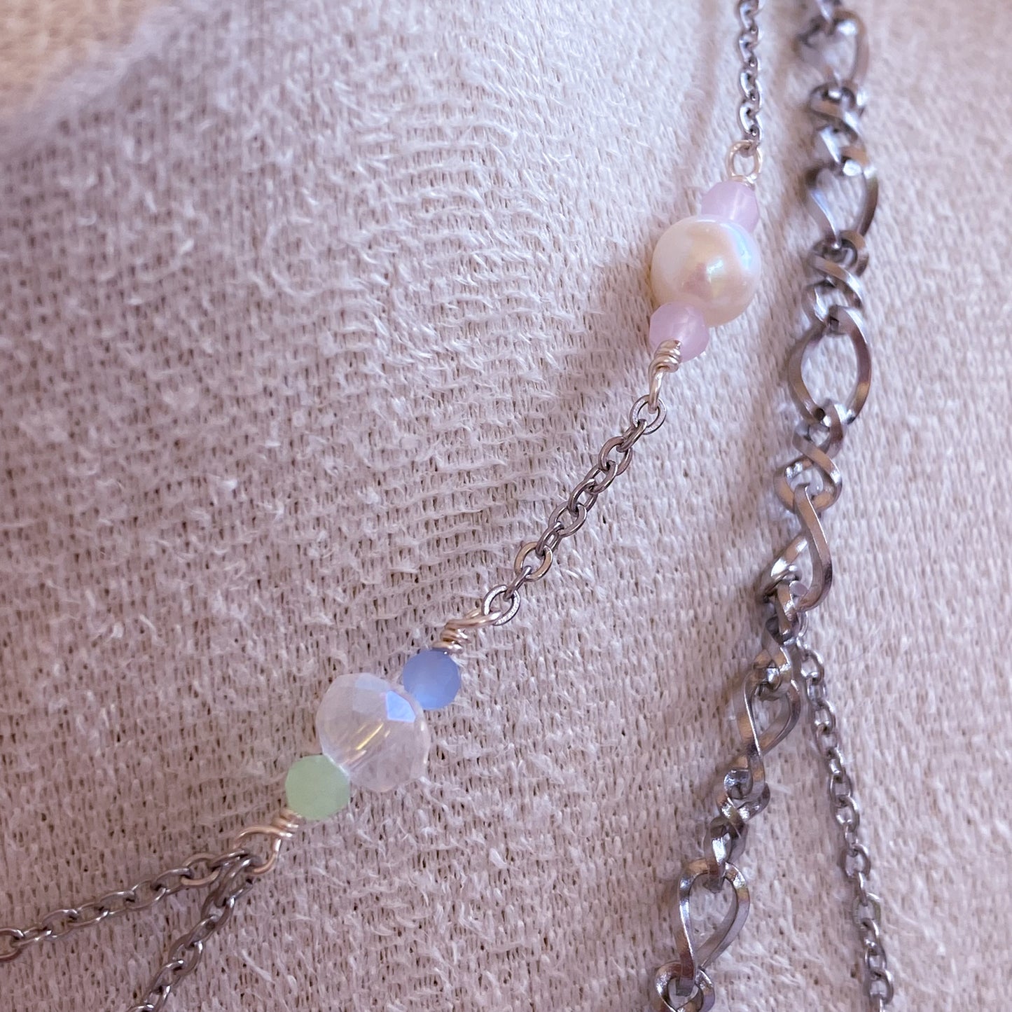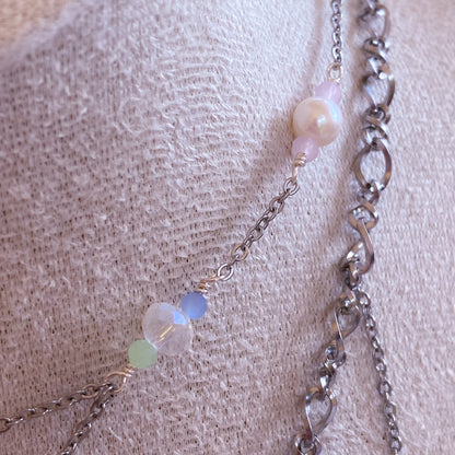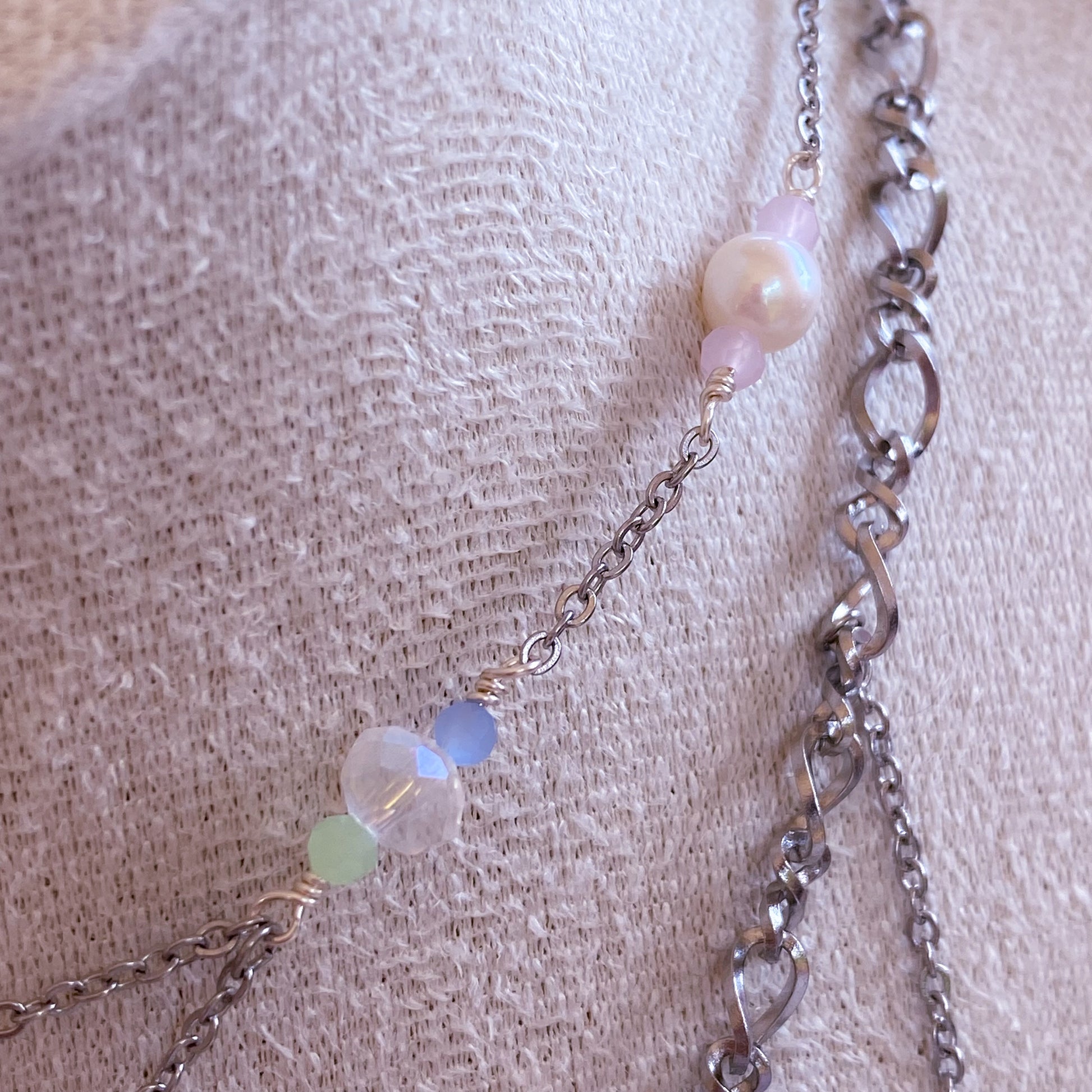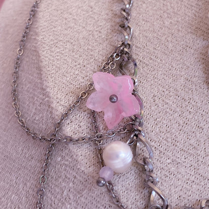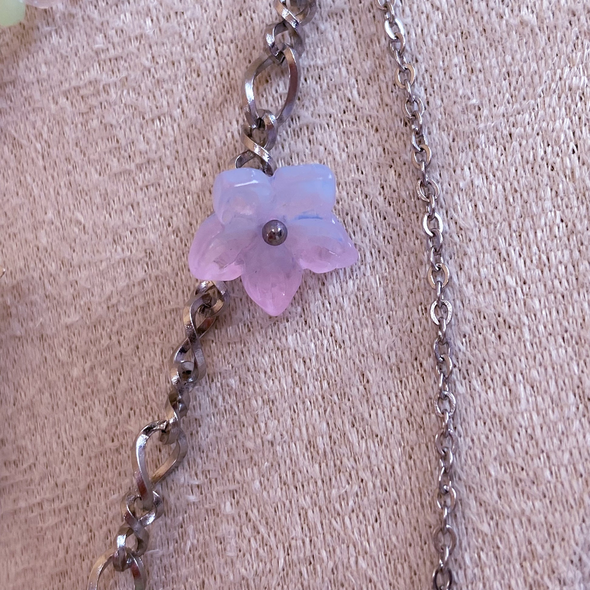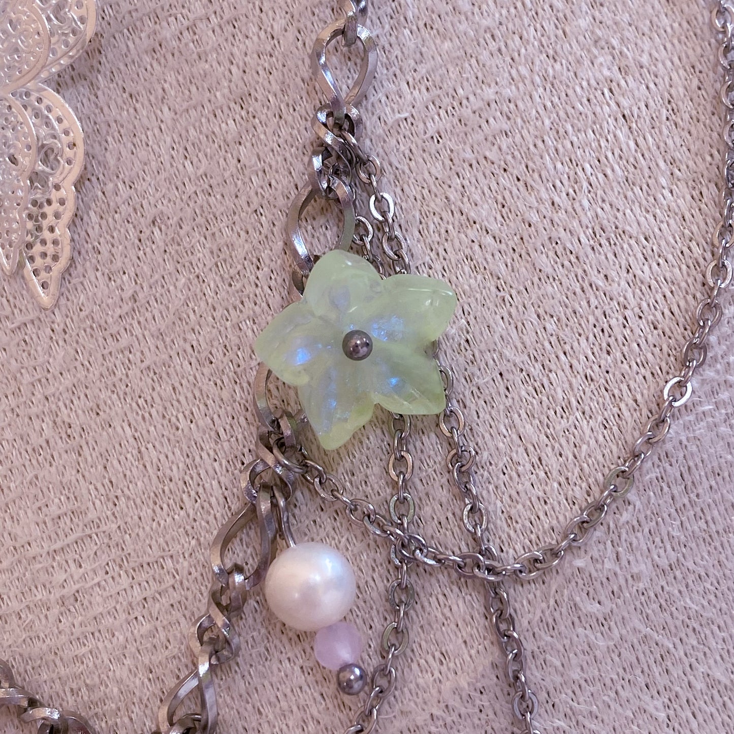 Delicate and dreamy, the Fairy's Kiss Necklace whispers tales of a mystical realm inhabited by faeries and ancient magic. A filigree butterfly pendant dances amidst a cascade of shimmering crystal beads and precious freshwater pearls that sparkle like dew-kissed morning petals. Tiny flower pendants in gentle lavender, pink, and green dance alongside. The necklace's crowning glory is a majestic sword-shaped pendant, adorned with three delicate butterflies on its blade, as if Nature's gentle touch has reclaimed this forgotten treasure. Perfect for fairies and fairy tale lovers alike, this enchanting piece is a testament to the beauty of whimsy and wonder✨🌸🦋